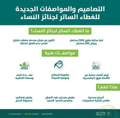 أصدرت وزارة الشؤون البلدية والقروية تعميمًا لجميع الأمانات بمختلف مناطق ومحافظات السعودية من أجل العمل بالتصميم والمواصفات النموذجية للغطاء الساتر لجنائز النساء أثناء التشييع.